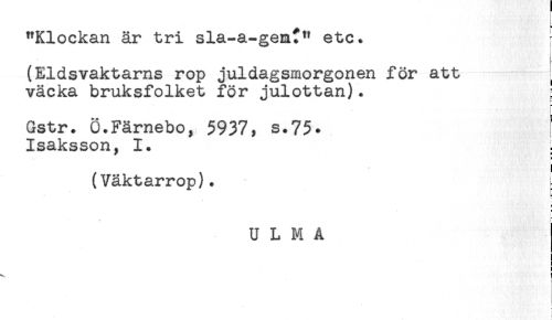 //// [ //// "Klockan är tri sla-a-gen?" etc. //// (Eldsvaktarns rop juldagsmorgonen för att ! //// väcka bruksfolket för julottan). //// Gstr. Ö.Fämebo, $937, s.75. //// Isaksson, I. ! //// ! //// ) //// (Väktarrop). [ //// - //// L //// U L M A //// ! ////