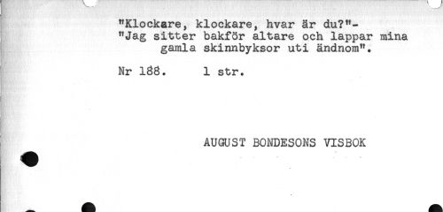 //// "Klockare, klockare, hvar är du?"- //// "Jag sitter bakför altare och lappar mina //// gamla skinnbyksor uti ändnom". //// i //// t * //// Nr 168. 1 str. //// å- //// < //// AUGUST BONDESONS VISBOK ////