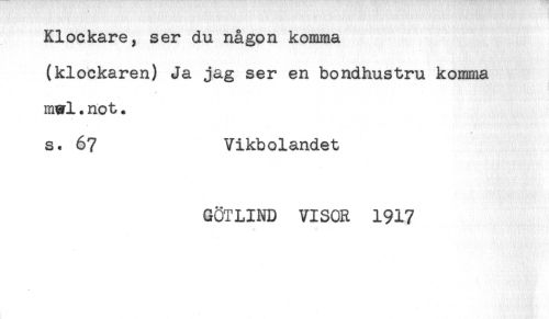 //// Klockare, ser du någon komma //// (klockaren) Ja jag ser en bondhustru komma //// mwl.not. //// s. 67 Vikbolandet //// GÖTLIND VISOR 1917 ////