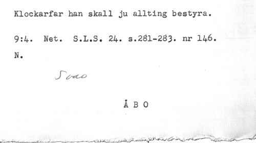 //// Klockarfar han skall ju allting bestyra. //// 9:4. Net. S.L.S. 24. s.281-283. nr 146. //// N. //// ÅBO ////