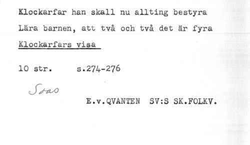 //// Klockarfar han skall nu allting bestyra //// Lära barnen, att två och två det är fyra //// Klockarfars visa //// 10 str. s.274-276 //// E.v.QVANTEN SV:S SK.FOLKV. ////
