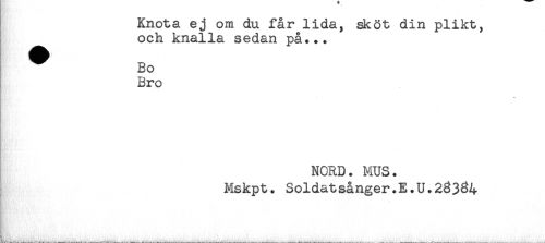 //// Knota ej om du får lida, sköt din plikt, //// och knalla sedan på... //// ^ Bo //// Bro //// NORD. MUS. //// Mskpt. Soldatsånger.E.U.28384 ////