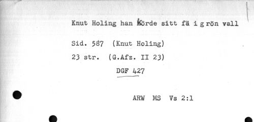 //// Knut Holing han &orde sitt fä i g rön vall //// - - r . --------- - //// Sid. 587 (Knut Holing) //// * //// 23 str. (G.Afz. II 23) //// DGF 427 //// ^ ARW MS Vs 2:1 ////