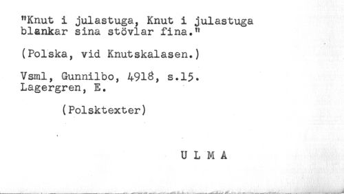 //// "Knut i julastuga, Knut i julastuga //// blankar sina stövlar fina." //// * //// (Polska, vid Knutskalasen.) //// Vsml, Gunnilbo, 4913, s.15. //// Lagergren, E. //// (Polsktexter) //// ! //// U L M A //// _ ^ , _________fV- ___^ - --..i- . ____________... - -_. ______ ////