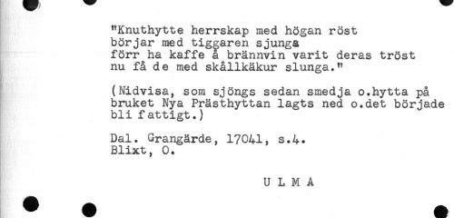 //// "Knuthytte herrskap med högan röst //// börjar med tiggaren sjunga //// förr ha kaffe å brännvin varit deras tröst //// nu få de med skållkäkur slunga." //// (Nidvisa, som sjöngs sedan smedja o.hytta på //// bruket Nya Prästhyttan lagts ned o.det började //// bli fattigt.) //// Dal. Grangärde, 17041, s.4. //// Blixt, 0. //// U L M A ////