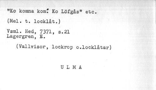 //// "Ko komna komf Ko Löfgås" etc. //// (Mel. t. locklåt.) //// Vsml. Hed, 7371, s.21 //// Lagergren, E. //// (Vallvisor, lockrop o.locklåtar) //// U L M A ////