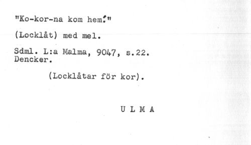 //// "Ko-kor-na kom hem?" //// (Locklåt) med mel. //// Sdml. L:a Malma, 9047, s.22. //// Dencker. //// (Locklåtar för kor). //// U L M A ////