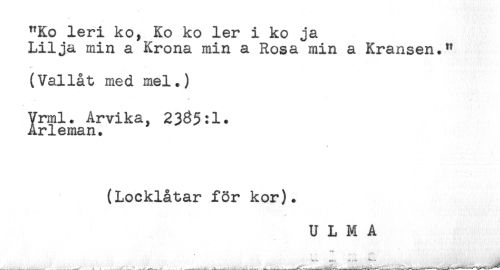//// "Ko leri ko, Ko ko ler i ko ja //// Lilja min a Krona min a Rosa min a Kransen." //// (Vallåt med mel.) //// Vrml. Arvika, 2335:1. //// Arieman. //// (Locklåtar för kor). //// U L M A //// ** //// OUt,.. * ** '**"'* ////