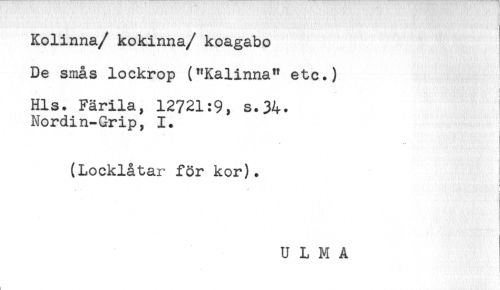 //// Kolinna/ kokinna/ koagabo //// De smås lockrop ("Kalinna" etc.) //// . . ' . '. ' i //// < //// ! //// Hls. Färila, 12721:9, s.34. //// Nordin-Grip, 1. //// (Locklåtar för kor). //// i //// U L M A ////
