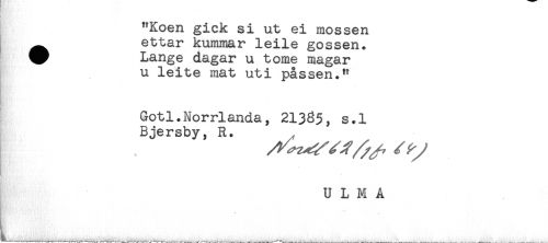 //// ( //// "Koen gick si ut ei mossen //// — ettar kummar leile gossen. //// ^ Lange dagar u tome magar //// u leite mat uti passen." //// Gotl.Norrlanda, 21335, s.l //// Bjersby, R. , //// U L M A ////