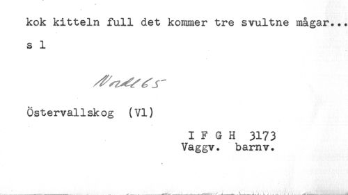//// kok kitteln full det kommer tre svultne mågar.+. //// s 1 //// Östervallskog (VI) //// I F G H 3173 //// Vaggv. barnv. ////