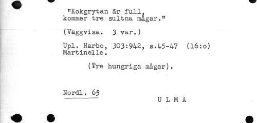 //// "Kokgrytan är full^ //// kommer tre sultna magar." //// * //// (Vaggvisa. 3 var.) //// Upl. Harbo, 303:942, s.45-47 (l6:o) //// Martinelie. //// (Tre hungriga mågar). //// Nordl. 65 //// --U L M A ////