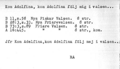 //// Kom Adolfina, kom Adolfina följ mig i valsen... //// t //// B ll,s.58 Nya Fiskar Valsen. 8 str. //// B 28:3,s.33. Nya Friarevalsen. 8 str. //// B 73:3,s.89 Friare Valsen. 8 str. //// A 16:445. " " 8 str., kom. //// < //// Jfr Kom Adelfina,kom Adelfina följ mej i valsen..] //// t //// ! //// * t //// i //// ! //// L //// ' . * j. //// RA //// i //// t //// : //// ! ////