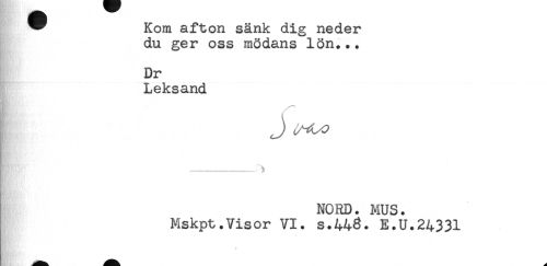//// * Kom afton sänk dig neder //// du ger oss mödans lön... //// Leksand //// j J ^ //// NORD. MUS. //// Mskpt.Visor VI. s.448. E.U.24331 ////
