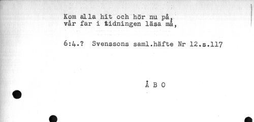 //// - - - ^ . ... * //// ' //// Kom alla hit och hör nu på. //// vår far i tidningen läsa ma, //// 6:4.? Svenssons saml.häfte Nr 12.s.117 //// ÅBO ////