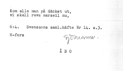 //// Kom alle man på däcket ut, //// vi skall reva marseil nu, //// 6:4. Svenssons saml.häfte Nr 14. s.3. //// ÅBO ////
