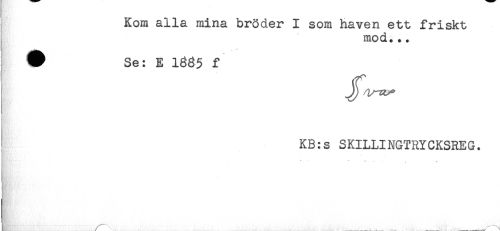 //// Kom alla mina bröder I som haven ett friskt //// mod..+ //// W Se: E f //// jf^-K?* //// KB:s SKILLINGTRYCKSREG. //// ....... . ^ //// - //// f ////
