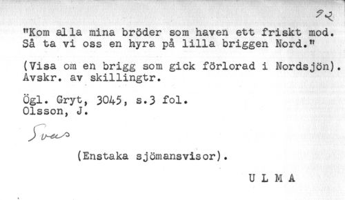 //// "Kom alla mina bröder som haven ett friskt mod. //// Så ta vi oss en hyra på lilla briggen Nord." //// (Visa om en brigg som gick förlorad i Nordsjön). //// Avskr. av skillingtr. //// 3 //// Ögl. Gryt, 3045, s.3 fol. //// Olsson, J. //// (Enstaka sjömansvisor). //// U L M A ////