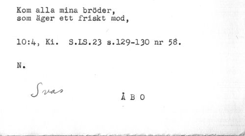 //// Kom alla mina bröder, //// som äger ett friskt mod, //// 10:4, Ki. S.LS.23 s.129-130 nr 58. //// N. //// ^^ Å B 0 ////