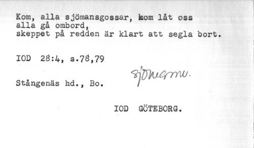 //// Kom, alla sjömansgossar, kom låt oss //// alla gå ombord, ! //// skeppet på redden år klart att segla bort. //// i //// t //// IOD 28:4, s.73,79 //// Stångenäs hd., Bo. F //// , * //// i //// IOD GÖTEBORG. //// < //// ] ////
