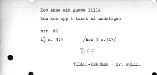//// Kom Anna min gumma lilla //// Kom kom upp i taket så modeligen //// n:r 60 //// s. 355 /årw 3 s.317/ //// TILLH.-DENCKER SV. FOLKL. ////