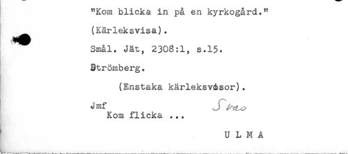 //// "Kom blicka m pa en kyrkogård." //// &.. //// ^^ (Kärleksvisa). //// Smål. Jät, 2303:1, s.15. //// A //// Strömberg. //// (Enstaka kärleksv&sor). //// JiRf J //// Kom flicka ... //// ! U L M A //// L...... ^ . ////