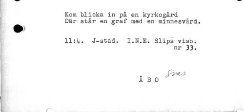 //// Kom blicka in på en kyrkogård //// I! ^^ Där står en graf med en minnesvård. //// 11:4. J-stad. I.N.E. Slips visb. //// nr 33. //// w. J //// , A B 0 ////