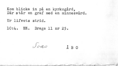 //// Kom blicka in på en kyrkogård, //// Där står en graf med en minnesvård. //// Ur lifvets strid. //// 10:4. EE. Brage 11 nr 25. //// Jl^y ÅBO ////