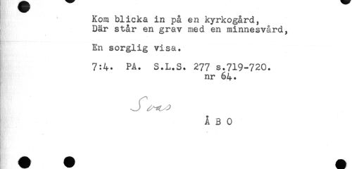 //// ^ Kom blicka in på en kyrkogård, //// Där står en grav med en minnesvård, //// En sorglig visa. //// 7:4- PA. S.L.S. 277 s.719-720. //// nr 64. //// r' //// ! //// ÅBO ////