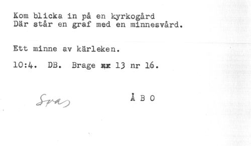 //// Kom blicka in på en kyrkogård //// Där står en graf med en minnesvård. //// Ett minne av kärleken. //// 10:4. DB. Brage xx 13 nr 16. //// J^P * B 0 ////