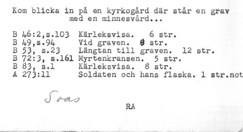 //// Kom blicka in pa en kyrkogård där star en grav //// med en minnesvård... //// B 46:2,s.103 Kärleksvisa. 6 str. //// B 49,s.94 Vid graven. $ str. //// B 53, s.23 Längtan till graven. 12 str. //// B 72:3, s.l6l Myrtenkransen. 5 str. //// B 83, s.l Kärleksvisa. 6 str. //// A 273*11 Soldaten och hans flaska. 1 str.not //// RA ////