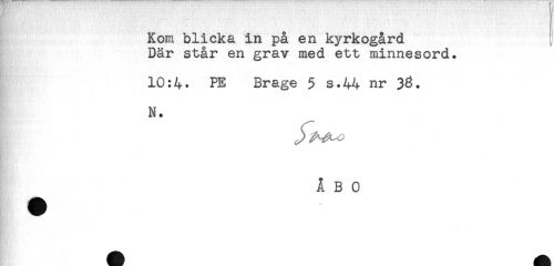 //// Kom blicka in på en kyrkogård //// Där står en grav med ett minnesord. //// ''< *? ' * t ' //// * . ' : . . //// . . //// 10:4. PE Brage 5 s.44 nr 38. //// N. //// ÅBO ////
