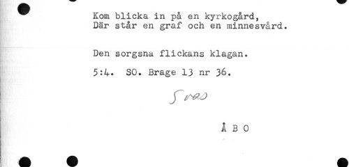 //// Kom blicka in på en kyrkogård, //// Där står en graf och en minnesvård. //// Den sorgsna flickans klagan. //// 5:4. SO. Brage 13 nr 36. //// ÅBO ////