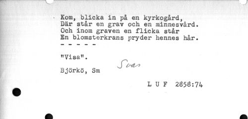 //// Kom, blicka in på en kyrkogård, //// Där står en grav och en minnesvård. //// Och inom graven en flicka står //// En blomsterkrans pryder hennes hår. //// "Visa". //// Björkö, Sm //// L U F 2858:74 //// - ////