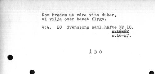 //// . — - ... ..- . . < //// Kom bredom ut våra vita dukar, //// vi vilja över havet flyga. //// 9:4* BO Svenssons saml.häfte Nr 10. //// s.46-47. //// P - ÅBO ////