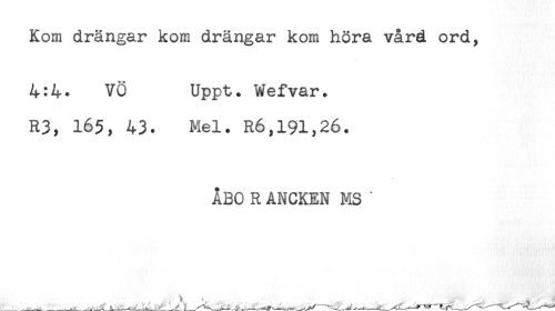 //// Kom drängar kom drängar kom höra vårå ord, //// 4:4. VÖ Uppt. Wefvar. //// R3, 165, 43. Mel. R6,l91,26. //// ÅBO R ANCKEN MS * ////