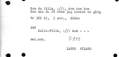 //// Kom du lilla^ ://:, kom kom kom //// Kom ska du fa hvad jag lovade en gång //// * //// Nr 365 b), 1 str., Sibbo //// Jmf //// Kalle-Ville, ://: kom --- //// mel.not. //// LAGUS NYLAND ////