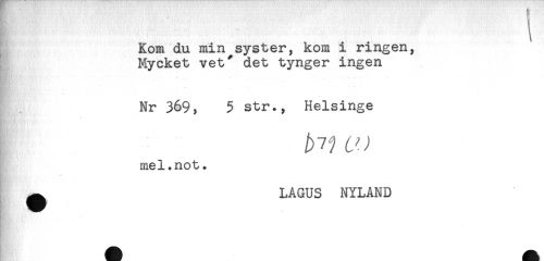 //// Kom du min syster, kom i ringen, //// Mycket vet* det tynger ingen //// Nr 369, 5 str., Helsinge //// mel.not. //// ^ LAGUS NYLAND //// * ////