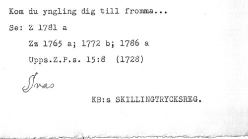 //// Kom du yngling dig till fromma... //// Se: Z 1781 a //// Zz 1765 a; 1772 bj 1786 a //// Upps.Z.P.s. 15:8 (1728) //// KB:s SKILLINGTRYCKSREG. ////