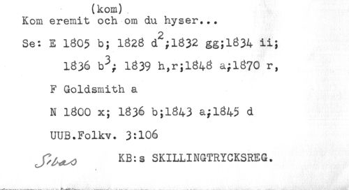 //// Kom eremit och om du hyser... //// Se: E 180$ b; 1828 d^;l832 gg;l834 ii; //// 1836 b3; 1839 h,r;l848 a;l870 r, //// F Goldsmith a //// N 1800 x; 1836 b;l843 a;l845 d //// UUS.Folkv. 3:106 //// SKILLINGTRYCKSREG. ////