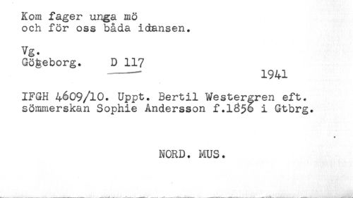 //// Kom fager unga mö //// och för oss båda idansen. //// Vg. //// Göteborg. D 117 //// ---1941 //// IFGH 4609/10. Uppt. Bertil Westergren eft. //// sömmerskan Sophie Andersson f.1856 i Gtbrg. //// * //// NORD. MUS. ////