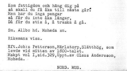 //// Kom fattigdom och häng dig på //// så skall du få åka till nästa går? //// Men har du inga pengar //// så får du inte åka länger, //// Då får du stia å, å traska å gå. //// Sm. Allbo hd. Moheda sn. //// Rikemans visa. //// Eft.Joh:s Petterson,Häriatorp,Slätthög, som //// levde vid mitten av 1800-talet. //// Mskpt vol I,sid.329,Uppt.av Olaus Andersson, //// Moheda. - ////