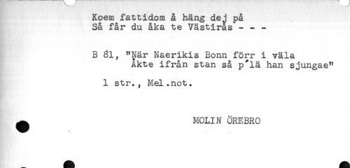 //// Koem fattidom å häng dei på //// Så får du åka te Västiras - - - //// B "När Naerikis Bonn förr i väla //// Åkte ifrån stan så p*lä han sjungae" //// 1 str., Mel.not. //// ^ MOLIN ÖREBRO ////