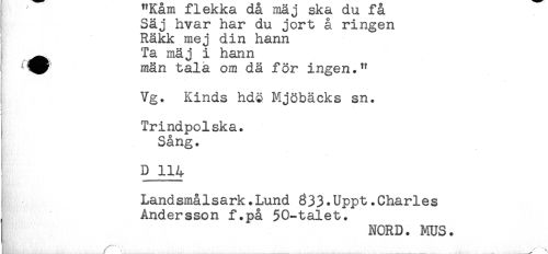 //// Säj hvar har du jort å ringen //// Räkk mej din hann //// ^ Ta mäj i hann //// män tala om dä för ingen." //// Vg. Kinds hdö Mjöbäcks sn. //// Trindpolska. //// Sång. //// D_114 //// Landsmålsark.Lund 833 * Uppt.Charles //// Andersson f.på 50-talet. //// NORD. MUS. //// i r "< ______________ ////