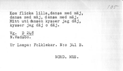 //// Kom flicka lilla,dansa med mäj, //// dansa med mäj, dansa med mäj. //// Mitt uticänsen kysser jag däj, //// kysser jag däj o däj. //// Vg. D 248 //// N.Vadsbo. //// Ur Lampa: Folklekar. N:o 341 B. ////