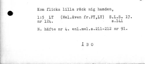 //// Kom flicka lilla räck mig handen, //// 1:5 LT (Mel.även fr.PY,LT) S.L.S. 17. //// nr 124. s.141 //// H //// I N. häfte nr 4. enl.mel.s.211-212 nr 91. //// i ÅBO //// . , ______________.. ////