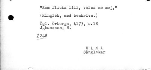 //// "Kom flicka lill, valsa me mej," //// ^ (Ringlek, med beskrivn.) //// ' Ögl. Örberga, 4173, s.l8 //// Johansson, H. //// ^248 //// U L M A //// I Sånglekar //// ! ^ ' . . ________' ////