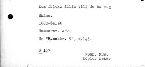 //// Kom flicka lilla vill du ha mig //// ^ Skåne. //// l380-6alet //// Hammarst. ark. //// Ur "Mammskr. 9", s.145. //// ' D 157 //// ------NORD. MUS. //// Kopior Lekar //// —. ////