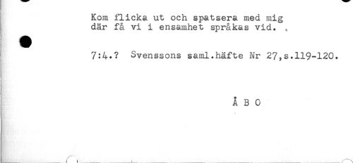//// Kom flicka ut och spatsera med mig //// där få vi i ensamhet språkas vid. //// 7:4.? Svenssons saml.häfte Nr 27,s.119-120. //// ÅBO ////