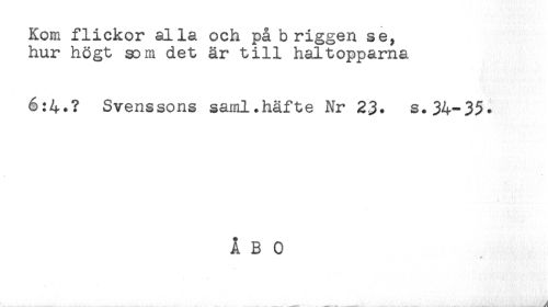 //// Kom flickor alla och på b riggen se, //// hur högt som det är till hal topparna //// 6:4.? Svenssons saml.häfte Nr 23. s.34-35. //// ÅBO //// ______________________^.................________ __________—' -___________________________ ////